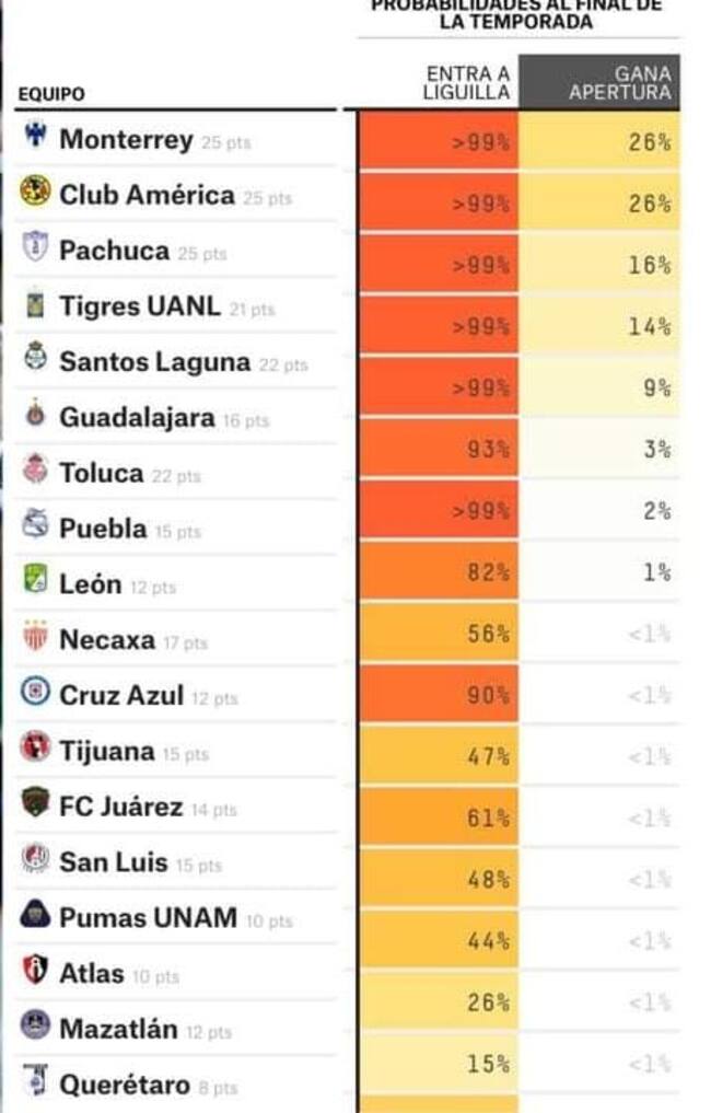 Por otra parte, los que tienen muy pocas chances de ser Campeón esta temporada, son Chivas, que a pesar de la mejoría, solo suma 3% del 100 total y Cruz Azul con 1% y sumido en una crisis importante de resultados que lo tienen en el fondo de la tabla.