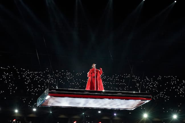 ‘Umbrella’, sencillo con el que se lanzó al estrellato, suena en Arizona mientras se eleva de nuevo por los aires y sus bailarines se distribuyen por toda la cancha.