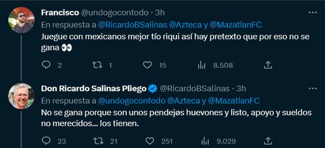 A pesar de que hay rumores de que sus redes sociales nos la maneja al 100 el empresario, Ricardo Salinas volvió a causar revuelo en Twitter, esta vez por insultar abiertamente a los jugadores de Mazatlán, club del cual es dueño y que ha tenido un Clausura 2023 para el olvido.