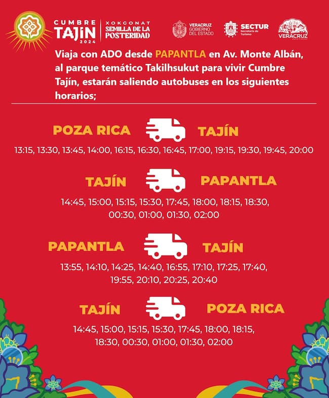 Los autobuses saldrán desde Papantla, en Av. Monte Albán al parque temático a las 13:55, 14:10, 14:25, 14:40, 16:55, 17:10, 17:25, 17:40, 19:55, 20:10, 20:25 y 20:40 horas; y desde Poza Rica centro a las 13:15, 13:30, 13:45, 14:00, 16:15, 16:30, 16:45, 17:00, 19:15 y 20:00 horas.