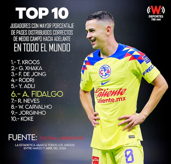 De acuerdo a un estudio del Football Observatory, Álvaro Fidalgo es el sexto mejor jugador del planeta, en cuanto a pases distribuidos de mitad de campo hacia adelante, quedando por encima de nombres como Ruben Neves del Al Hilal, Kke del Atlético de Madrid o Jorginho del Arsenal.