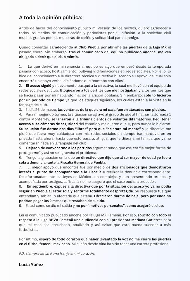 “Leí el comunicado publicado anoche por la Liga MX Femenil. Por eso, solicito con todo el respeto a la Liga BBVA Femenil una audiencia con su presidenta Mariana Gutiérrez para que mi caso sea escuchado, analizado y así evitar que esto pueda suceder a más futbolistas. Por último, espero de todo corazón que haber levantado la voz no me cierre las puertas en el futbol femenil mexicano. Mi sueño desde niña ha sido tener una carrera profesional”.
