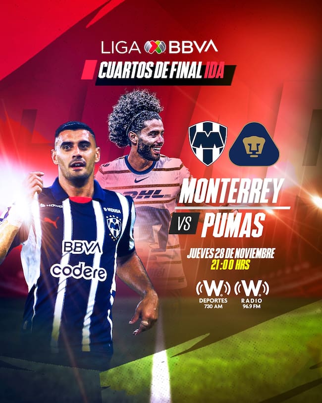 Gran partido de liguilla se vivirá entre Monterrey y Pumas en los Cuartos de Final de Ida, y se podrá escuchar a través de la Cadena W.
