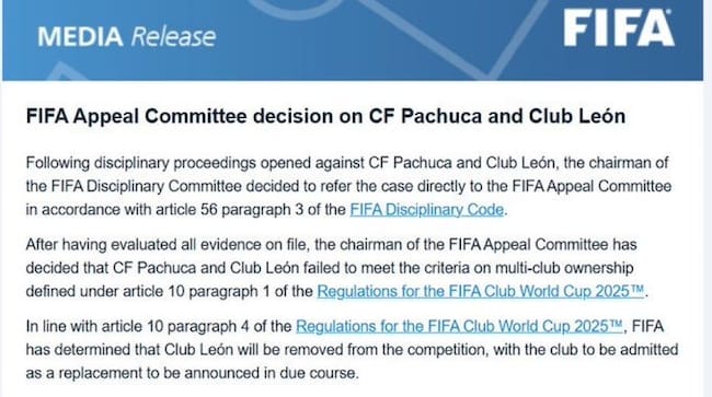 “Están controlados por las mismas personas, quienes ejercen una influencia significativa sobre sus respectivos procesos de toma de decisiones. Esto se evidencia por su afiliación con Grupo Pachuca y su estructura”, se puede leer en un escrito publicado en el sitio web de FIFA.