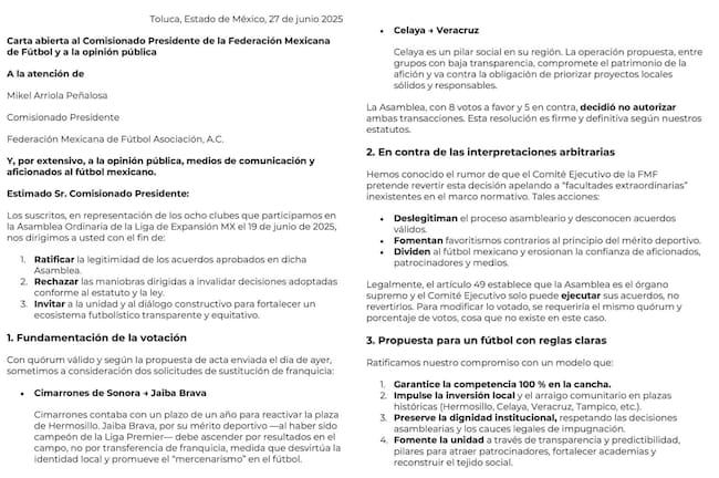 En el escrito dirigido a Mikel Arriola, se comunica que las formas en las que se han manejado las decisiones en la reciente asamblea distan mucho de ser regulares, reclaman ‘mercenarismo’ en el trato a Tampico Madero y adviertes de situaciones turbias en el posible paso de franquicia de Celaya a Veracruz.