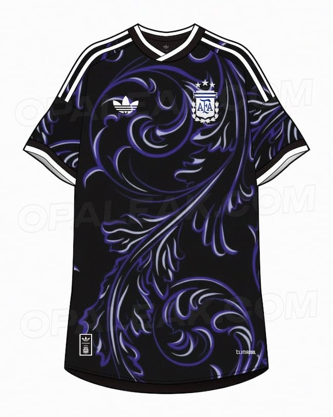 No es una sorpresa, Adidas, socio eterno de la Albiceleste, sabe que cada diseño debe honrar el legado de tres estrellas bordadas, pero también innovar para un público global que devora tendencias. El diseño filtrado, difundido por el sitio especializado Opaleak, rompe con la línea violeta que tanto nos regaló momentos icónicos en Qatar 2022. En su lugar, emerge un fondo negro como base dominante, salpicado de arabescos intrincados en tonos violeta, azul eléctrico y blanco.