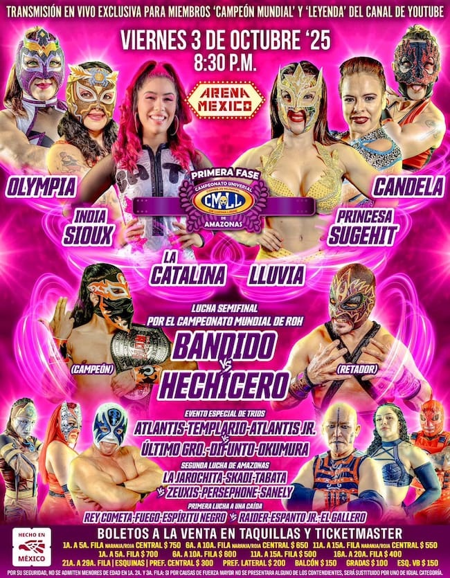 El CMLL arranca el Mes de las Amazonas con la primera eliminatoria del Campeonato Universal 2025 en la Arena México, además de la esperada lucha entre Bandido y Hechicero por el Campeonato Mundial de ROH, en una función del Viernes Espectacular que promete grandes emociones.