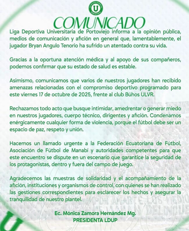 En un comunicado oficial, el club manabita no solo confirmó el atentado.
