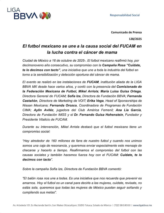 La Liga BBVA MX reafirmó su compromiso social al colaborar con FUCAM en la campaña rosa “Cuídate, te lo decimos con tacto”, entregando prótesis mamarias externas y promoviendo la prevención del cáncer de mama durante el mes de octubre