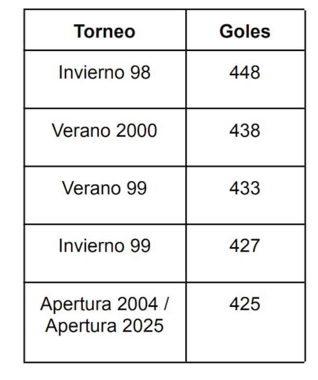 el Apertura 2025 ya compite por ser uno de los torneos con más anotaciones en la historia del futbol mexicano debajo del Invierno 98, Verano 2000, Verano 99 e Invierno 99.