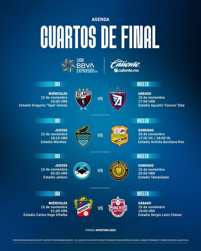La acción inicia este miércoles 12 de noviembre, a continuación te traemos todos los detalles para que no te pierdas ni un segundo de esta “fiesta grande”. La Liguilla arranca con los Potros de Hierro del Atlante, líderes invictos de la tabla general con 30 puntos y la mejor defensa del torneo (solo 10 goles en contra), como uno de los grandes favoritos.