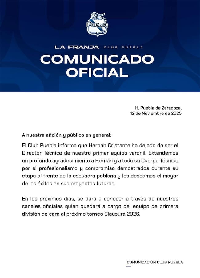 El Club Puebla anunció la salida de Hernán Cristante tras un Apertura 2025 lleno de tropiezos. La Franja busca nuevo técnico rumbo al Clausura 2026.