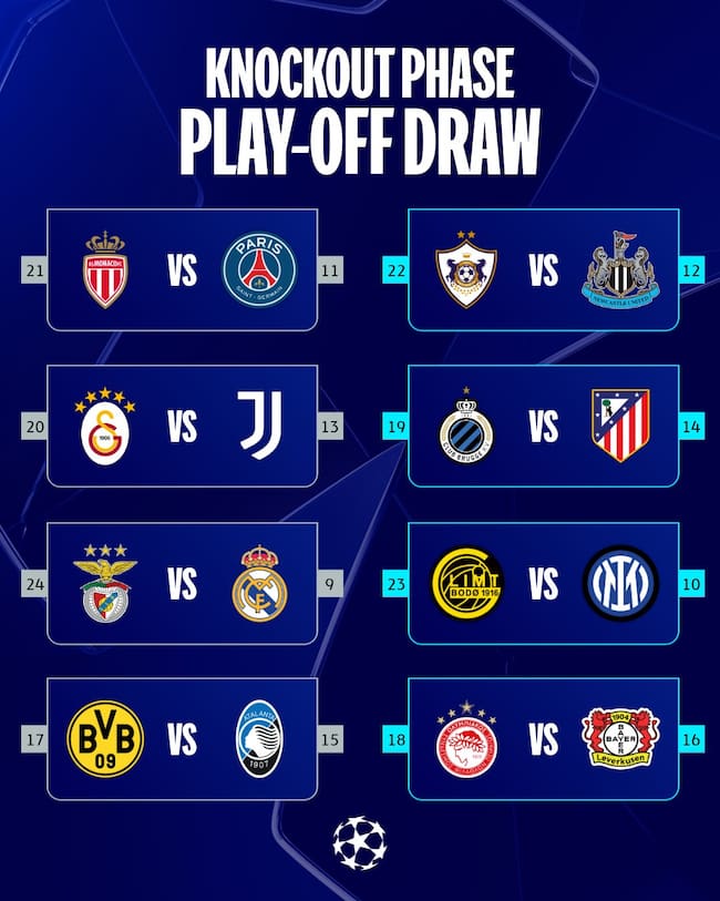 Tras el sorteo realizado este viernes en Nyon, Suiza, la UEFA definió los ocho cruces de los playoffs eliminatorios de la Champions League 2025/26. Estos duelos a doble partido decidirán qué equipos se unen a los ocho mejores de la fase de liga de la Champions League que ya tienen boleto directo a octavos de final en la siguiente ronda.