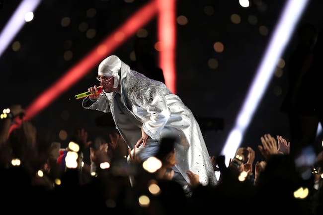 Football: Super Bowl LIV: Bad Bunny performing during halftime show of San Francisco 49ers vs Kansas City Chiefs game at Hard Rock Stadium. Miami Gardens, FL 2/2/2020 CREDIT: David E. Klutho (Photo by David E. Klutho /Sports Illustrated/Getty Images) (Set Number: X163164 TK1 ) / David E. Klutho