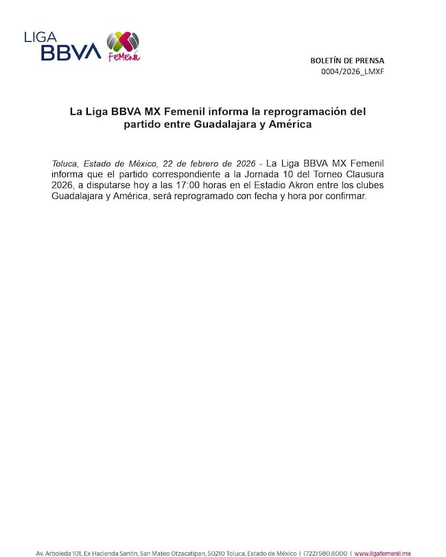 Ante este contexto, la Liga MX Femenil anunció oficialmente la postergación del encuentro correspondiente a la Jornada 10 del Clausura 2026, que estaba previsto para jugarse a las 17:00 hrs en el Estadio Akron.